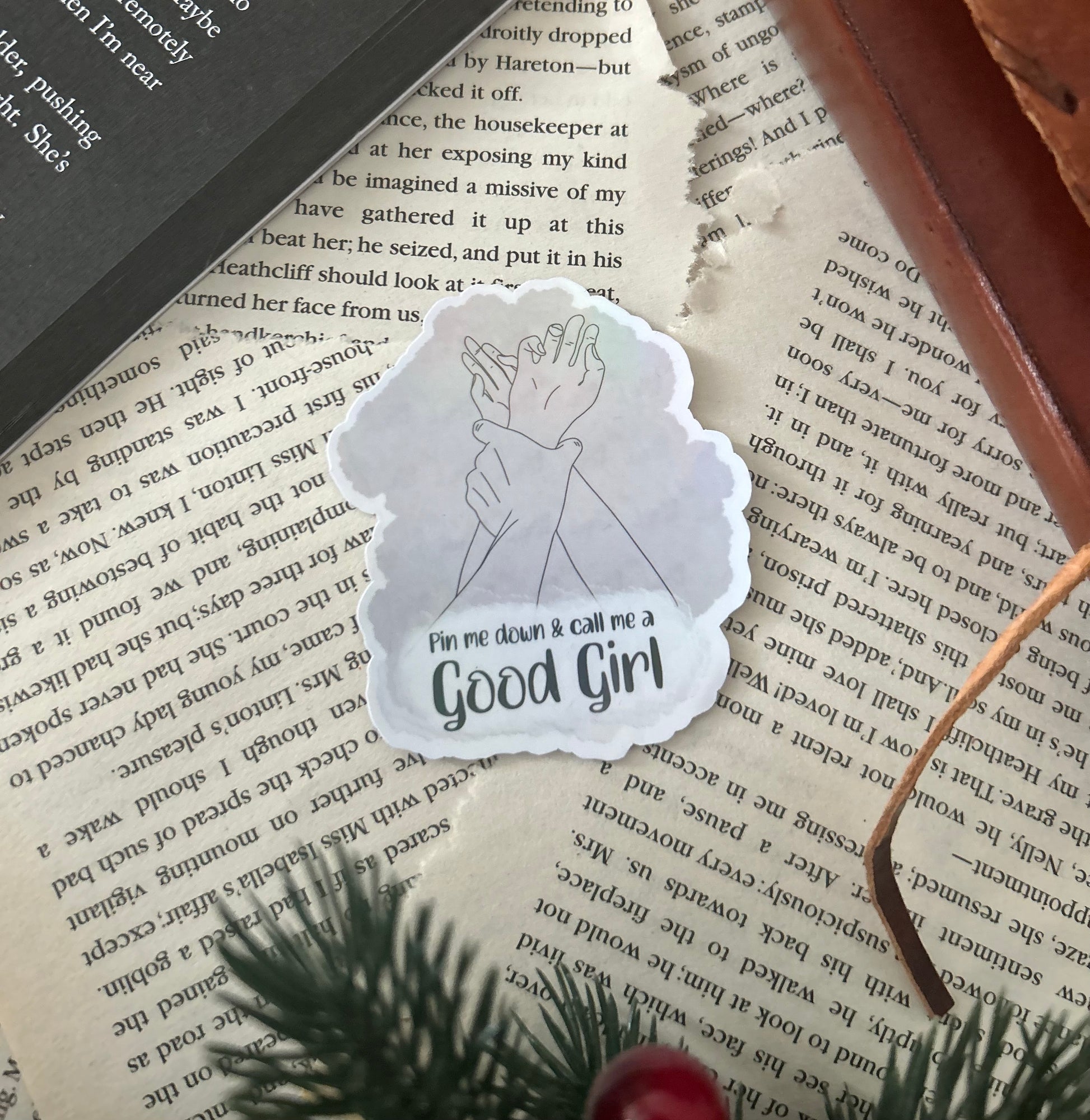 'Pin me down and call me a Good Girl' line art sticker, with holographic overlay.